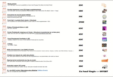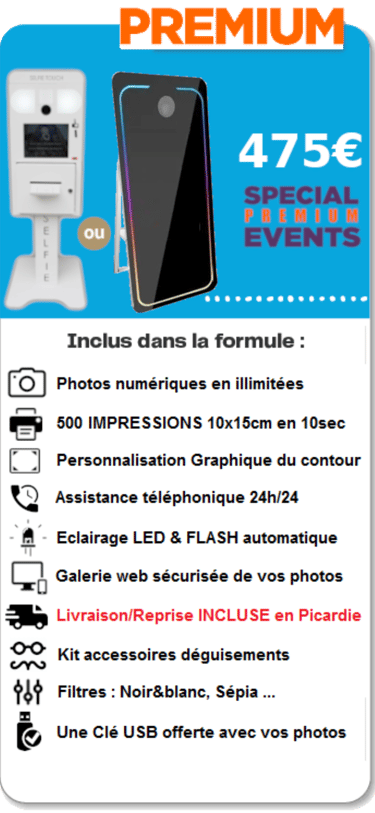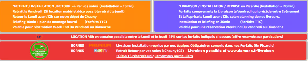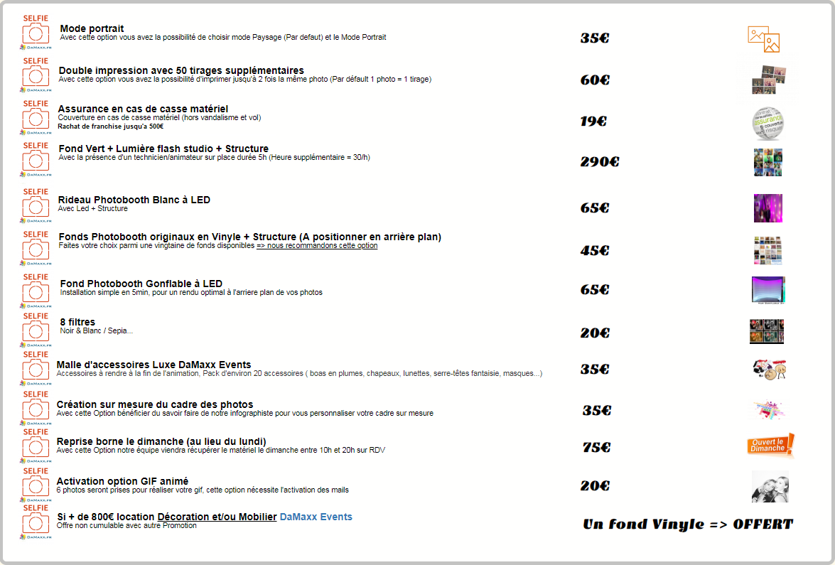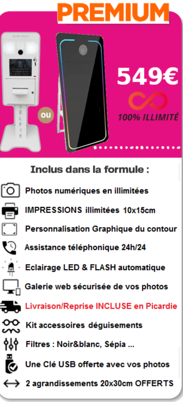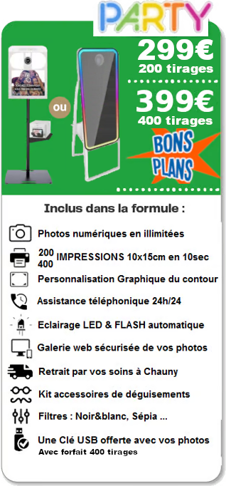 Tous nos forfaits incluent la mise a disposition du photobooth avec ou sans livraison. Votre borne photo est utilisable une soirée en semaine ou un weekend complet du vendredi au lundi. Vous n’êtes pas limités par le temps et vous pouvez utiliser la borne photo autant que vous le souhaitez, des préparatifs au débarrassage de la salle. Vous disposez également des photos digitales en illimité, y compris lorsque vos impressions sont épuisées.
